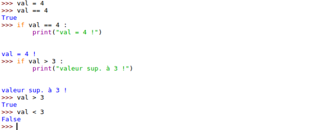 On remarque la déclaration des deux fonctions juste après les importation de modules. Dans ce programme en ligne 35 est défini le programme principal : Programme qui est appelé en premier lors de l'exécution du script. On remarque l'utilisation de la structure conditionnelle if variable == valeur : Les deux points annoncent un nouveau bloc (indentation) qui ne sera exécuté que si le test est vérifié (le test renvoie une variable booléenne True ou False). D'autres opérateurs de comparaison existent : <,>,<=,>= et !=. Quelques exemples à tester dans le prompt :