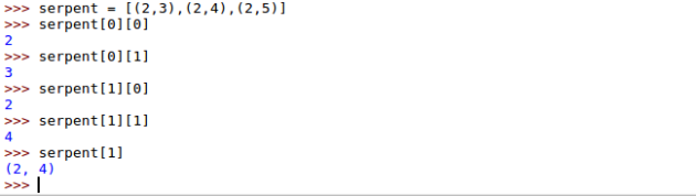 Pour la liste de tuple serpent, pour accédé au premier élément du premier tuple il suffit comme dans une liste de taper :