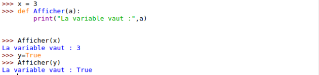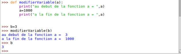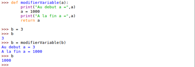 On constate ici que pour définir une fonction en python on utilise donc le mot clé def suivi du nom de la fonction. La fonction peut prendre ou non des paramètres. Dans l'exemple ci-dessus les deux fonctions modifient l'état des paramètres d'entrée. On parle alors de passage par référence. Après l'appel la variables passées en paramètre seront modifiées.