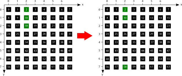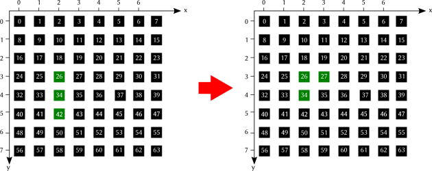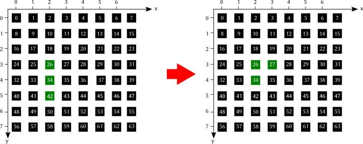 On multiplie la position en y par le nombre de LED par ligne (8) et on ajoute la position x :